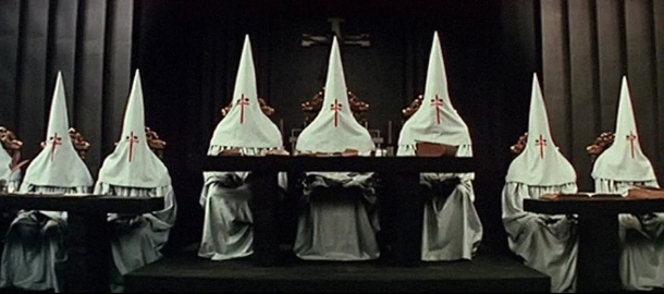 Když pak dojde na inscenovaný politický proces vedený náboženskou argumentací, knězi dochází, že se před soudci přiléhavě oděnými ve špičatých bílých kapích, které evokuji úbor Ku-klux-klanu, nelze obhájit.