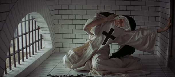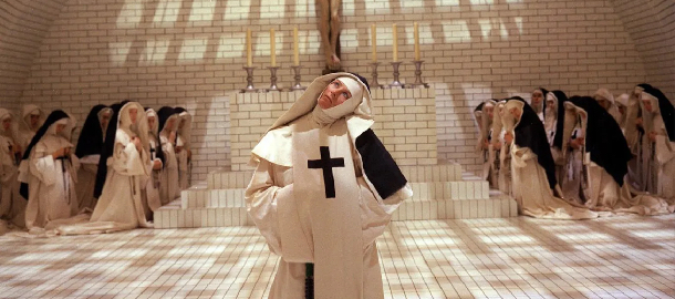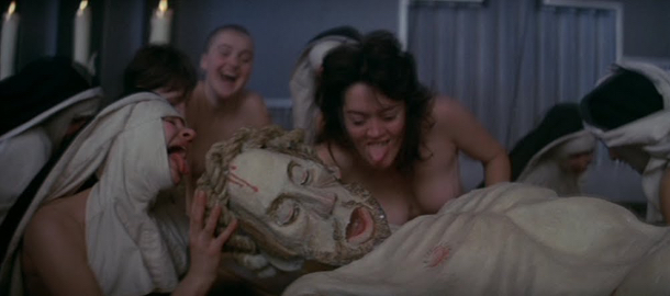 Velmi freudovsky vyznívá slavná orgiastická scéna, v níž se všechny klášterní neurózy vyderou na povrch ve výkřiku potlačované sexuality a touhy k moci. Sexuální represe dává sílu represi politické. A vymýtání se snadno zvrhne ve znásilnění. Tato extatická sekvence, v níž sestry ztratí veškeré zábrany a v rámci masového vytržení se začnou oddávat chlípnostem (dostane se i na drobný vtípek s relikvií), je chaosem sesterského kvílení a inkvizitorových klystýrů, momentem strhávání úborů i zábran.