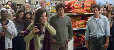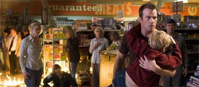 To, co se odehrává na širokém prostranství mezi nekonečnými pulty s potravinami, se v Darabontově podání až příliš podobá „trierovskému“ dialogu v neznatelných kulisách a s „ostatními“ lidmi za zády, kteří by to všechno měli slyšet, ale pravděpodobně neslyší. Odmyslete si navršené pytle se psím žrádlem, pokladny a chladící boxy a možná vám přijde, že k patáliím vnitřně rozervané Grace z Dogville a Manderlay má tenhle film blíž než se zprvu zdá. I přesné dělení na dějství (prakticky kopírují kapitoly v knihách) dává tušit všechny nejbližší zvraty a vrcholy; chybí už jen vypravěč, kterého při troše fantazie může zastupovat lady Carmodyová (přesvědčivě mimózní Marcia Gay Harden) coby „boží hromosvod“, kterým proudí mezi lidi všechny „pravdy“ a zvěsti. I ta ale zastupuje jednu vyhraněnou stranu barikády, které možná chybí hmotné motivy, za to si jde za svým s obrovským přesvědčením.