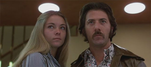 A i když je proplouvání znovunalezeným podsvětím látka divácky atraktivní, pro mě nakonec absolutního vítěze představuje milostné jiskření mezi Dustinem Hoffmanem a Theresou Russell. Scenáristicky už nemůže být více strohé, přesto působí plně a osudově. Potkají se a věci se rozehrají takřka okamžitě; žádné seznamovací tanečky, žádné zbytečné řeči. Oba vědí, proč v tom jedou. Jejich vztah táhnou neverbální dialogy říkající vše a dlouhé pohledy znamenající oddanost. On potřebuje něco udělat, ona na něj počká. Nebude ale čekat věčně a on to ví. Oba se potřebují, přitom spějí k nevyhnutelné zkáze. Takhle to žánru fakt sluší a Bonnie a Clyde by mohli závidět.