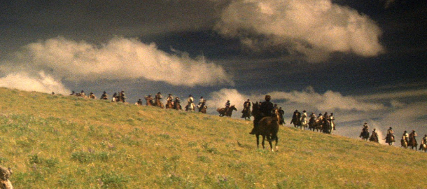 …ale zpět do Wyomingu mezi přistěhovalce, osadníky a pistolníky. Z každého záběru Nebeské brány dýchá láska k filmu a až spásný rozměr kinematografie. Od prvního okamžiku uchvátí úžasný worldbuilding – jak u některých snímků máte dojem, že za kulisami všechno končí, tady vše působí neuvěřitelně opulentně, hmotně a reálně. Cimino si dává načas a vyprávění nijak neuspěchává. Zřejmě někde tady mají původ legendy o tom, že již šestý den natáčení byl nikým nekorigovaný tvůrce pět dnů pozadu. Vezměte si jen scénu příjezdu vlaku do města Camper, která je oddalovaným diváckým orgasmem: vystupování z vlaku, rozhovor Jima s Cullym, vír města – k prvnímu incidentu, který teprve předznamenává hlavní konflikt, dojde až po bezmála 40 minutách budování světa.