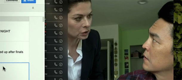 Režisér Aneesh Chaganty s tímhle neobvyklým přístupem k vizuálu zachází naštěstí dost opatrně. Po pár minutách si a něj člověk zvykne a za chvilku je to naprosto přirozené. Tady je odložený mobil, tady zapnutá průmyslová kamera, tamhle počítač s kamerou, do toho se vloží záběry z youtube, google map nebo ze čtení zpráv a tweetů. Šlape to, ovšem není to přeplácané a ačkoliv jsem se bál, že se to okouká, faktem je, že Chaganty přišel na spoustu způsobů, jak atraktivně a zajímavě natočit to, že John Cho sedí u počítače. Takže ačkoliv se ve filmu jakoby nic neděje a většina pátrání probíhá z kanceláře nebo obýváku, člověka to absolutně strhne. Pátrání je neskutečně rychle a svižně natočené extrémně komorní drama. Zní to jako protimluv, ale je to tak.