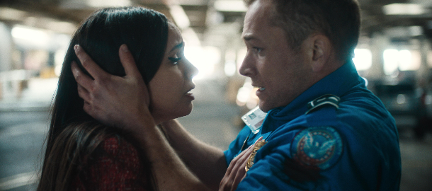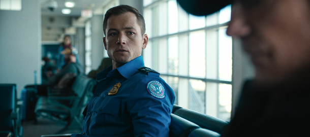 Začátek a prvních dejme tomu patnáct dvacet minut je ještě celkem fajn. Představuje se nám hlavní postava a jeho pohledná partnerka, v pozadí se lehce naťukává politický kontext a záhy se ocitáme na letišti, které je tu navzdory všemu, co víme o velkých letištích, celkem chytře smrštěno na pár důležitých a opakujících se lokací tak, aby se divák mohl snadno a rychle zorientovat. S nasazením sluchátka do ucha a úvodním hovorem mezi Egertonem a Batemanem začne ovšem padat nejen napětí, ale i veškerá logika, a jakmile na řadu přijdou Batemanovi poskoci Pat (Theo Rossi a jeho hrozivé úsměvy) a Mat (Logan Marshall-Green s něčím, co vypadá jako příčesek), nejradši byste si vzali devítku a vymalovali s ní zeď za vámi. Až tak špatní tihle dva jsou.