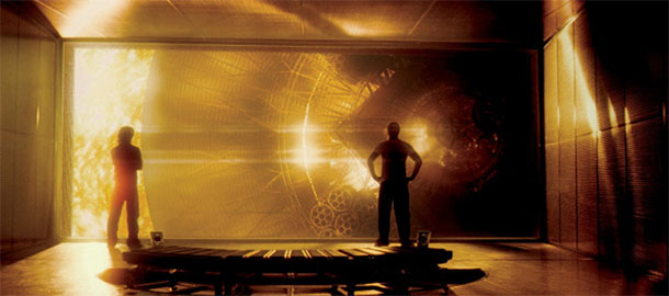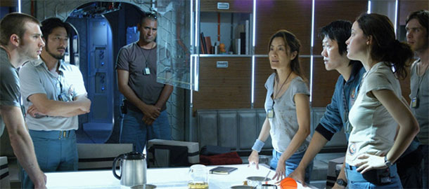V Sunshine vyráží posádka lodi Icarus nastartovat životodárnou fúzi chladnoucího Slunce. Tedy nic malého a v rámci našeho světa, který se bojí spíš globálního oteplování, ani okoukaného. Icarus je v podstatě monstrózní bomba, napěchovaná posledním zbylým uranem a nejmodernějšími technologiemi, ale v absolutních měřítkách je nicotná a stejně zranitelná jako její lidská posádka. A právě důsledná práce s měřítkem a dobře zvolenými kontrasty, kdy hluboký chlad dělí od smrtící výhně doslova pár metrů, dovoluje Boyleovi s Garlandem účinně gradovat šílenost celého podniku. Ačkoliv se postavy několikrát vydají plnit úkoly mimo loď, lehkost stavů bez tíže se ani náhodou nedostavuje. Tvůrci hrají naprosto na vážno a od začátku nám má být jasné, že tu nejsme ve stejném vesmíru, v jakém se odehrává třeba Bayův Armageddon, kde těžaři stíhají zachraňovat svět, machrovat a při tom ještě bodře hláškovat - aby řeč nestála.