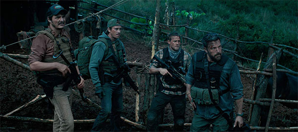 Triple Frontier svým tempem a stylem trošku připomíná Sicaria, což taky nebyl běžný akční film, Netflix jde ovšem ve své novince ještě dál. Režisér se opravdu cíleně vyhýbá tomu, aby divákům dával atraktivní scény jen proto, že očekávají, že tam nějaké atraktivní scény budou. Neříkám, že tam nejsou, jen je jednoduše potřeba si uvědomit, že k tomu, aby pětice drsňáků bojovala o život, jim stačí být uprostřed hor, v zimě a bez možnosti zapálit si oheň. Nemusí po nich střílet Danny Trejo z protipěchotního kulometu. Pro někoho může být tenhle přístup nudný, mně osobně však pomalé tempo a sázka na zajímavé hrdiny a dobré herce sedly úplně skvěle. Až na jednu výjimku se o hrdinech dozvíme jen pár informací, ale ono to stačí, protože Affleck, Isaacs, Hedlund, Hunnam i Pascal jsou uvěřitelní drsňáci a člověk jim prakticky okamžitě začne zobat z ruky a věří, že si spolu prošli tolika věcmi, že zkrátka není nutné o všem blábolit. Jeden pohled často řekne všechno podstatné a i přes vyhrocenost celé situace se tahle parta nemusí ujišťovat, že by jeden pro druhého klidně chytil kulku.
